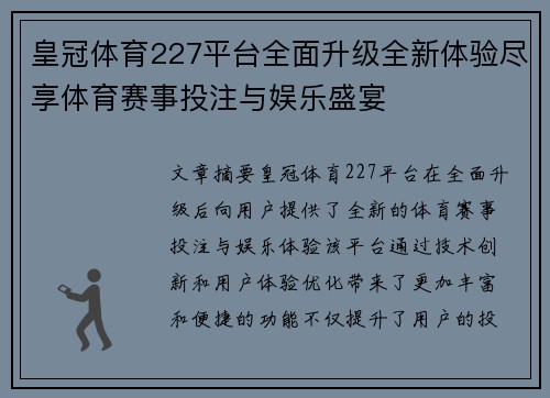 文章摘要:皇冠体育227平台在全面升级后,向用户提供了全新的体育赛事投注与娱乐体验。该平台通过技术创新和用户体验优化,带来了更加丰富和便捷的功能,不仅提升了用户的投注体验,还扩展了娱乐服务的范畴。在本文中,我们将从四个主要方面详细探讨皇冠体育227平台的全面升级,分别是平台界面的优化与创新、投注功能的多样化与智能化、娱乐功能的扩展与提升、以及安全保障与服务质量的提升。通过这些方面的阐述,读者能够全面了解皇冠体育227平台如何在竞争激烈的市场中脱颖而出,提供更具吸引力的体育赛事投注与娱乐体验。